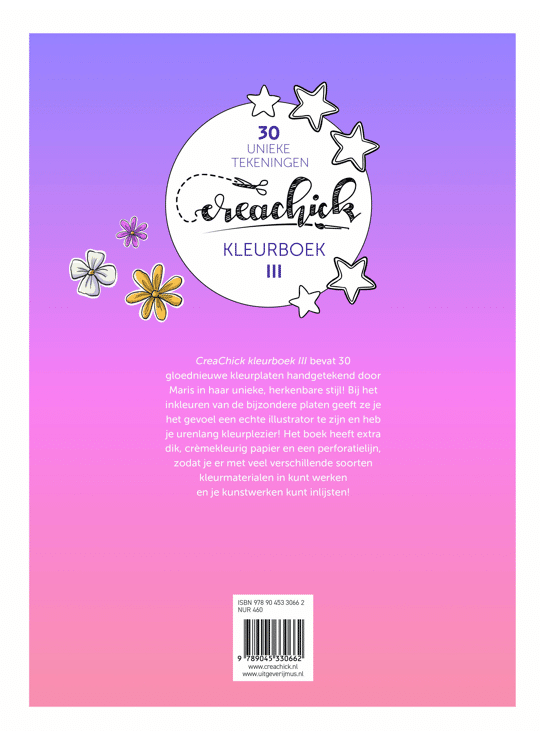 Het CreaChick kleurboek III bevat 30 gloednieuwe kleurplaten hand getekend door Maris in haar unieke, herkenbare stijl! Bij het inkleuren van de bijzondere platen geeft ze je het gevoel een echte illustrator te zijn en heb je urenlang kleurplezier! De kleurplaten in dit boek zijn divers, van portretten tot cosy kleurplaten die helemaal van deze tijd zijn. Het boek heeft extra dik, crèmekleurig papier en een perforatielijn, zodat je er met veel verschillende soorten kleurmaterialen in kunt werken en je kunstwerken kunt inlijsten!
