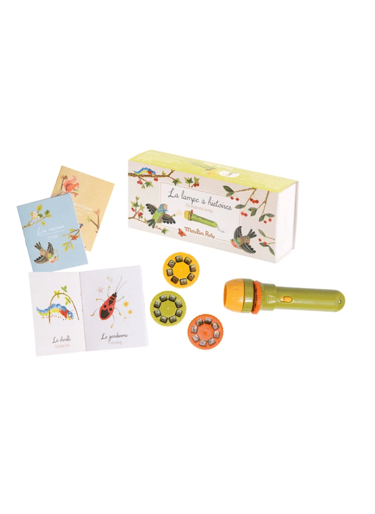 Een zaklampje bestaande uit drie in elkaar grijpende schijven. Elke schijf, geprojecteerd op de muur, vertelt in kleur een verhaal over de kleine dieren in de Moulin-tuin.
