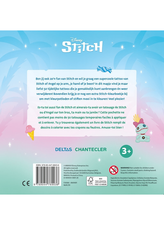 Cette jolie pochette ne contient pas moins de 50 tatouages temporaires de Stitch, que tu pourras appliquer et enlever facilement. Tu trouveras en plus un livre de Stitch rempli de dessins à colorier avec tes crayons ou feutres. Un cadeau original pour tous les fans de Stitch !