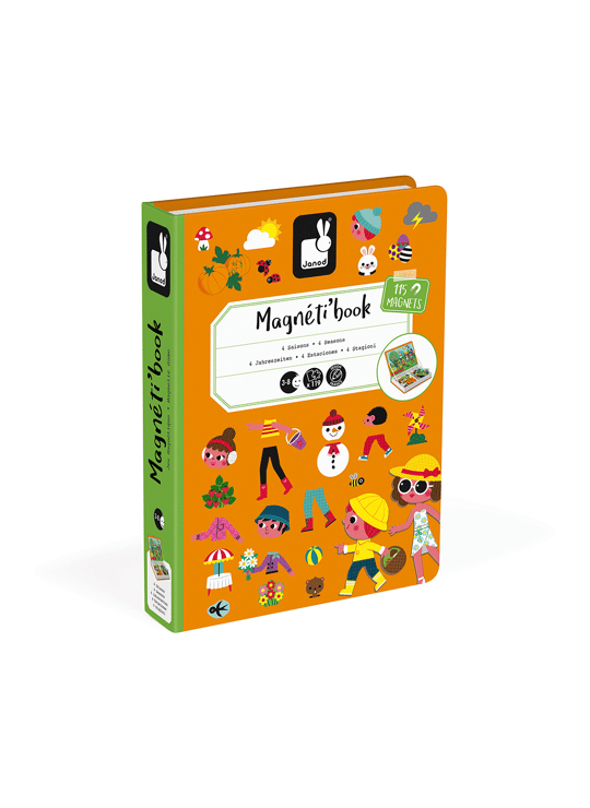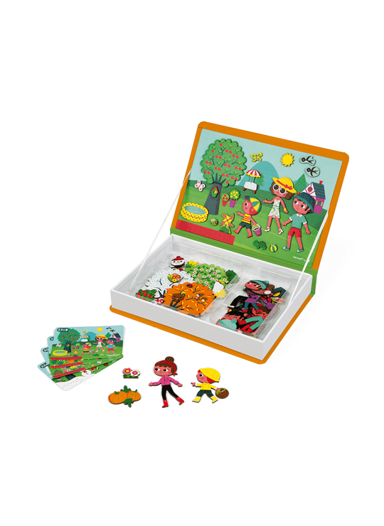De 4 seizoenen ontdekken dankzij het Magnéti'book! Magnéti'Books zijn slimme educatieve spelletjes voor kinderen vanaf 3 jaar, die gemakkelijk te vervoeren en op te bergen zijn! Met deze editie van de 4 seizoenen kunnen kinderen prachtige scènes maken en bedenken over de seizoenen heen. Ze zullen de bijzonderheden van elk seizoen kunnen ontdekken dankzij de 4 modelkaarten die ze zullen recreëren op het magnetische podium van het boek, en dit met behulp van de 115 meegeleverde magneten. Ze kunnen ook hun eigen verhalen bedenken en de scène creëren die ze willen. Dankzij het boekformaat is het gemakkelijk om het Magnéti'book op te bergen in een bibliotheek of mee te nemen op vakantie om de kinderen bezig te houden dankzij de oneindige mogelijkheden!