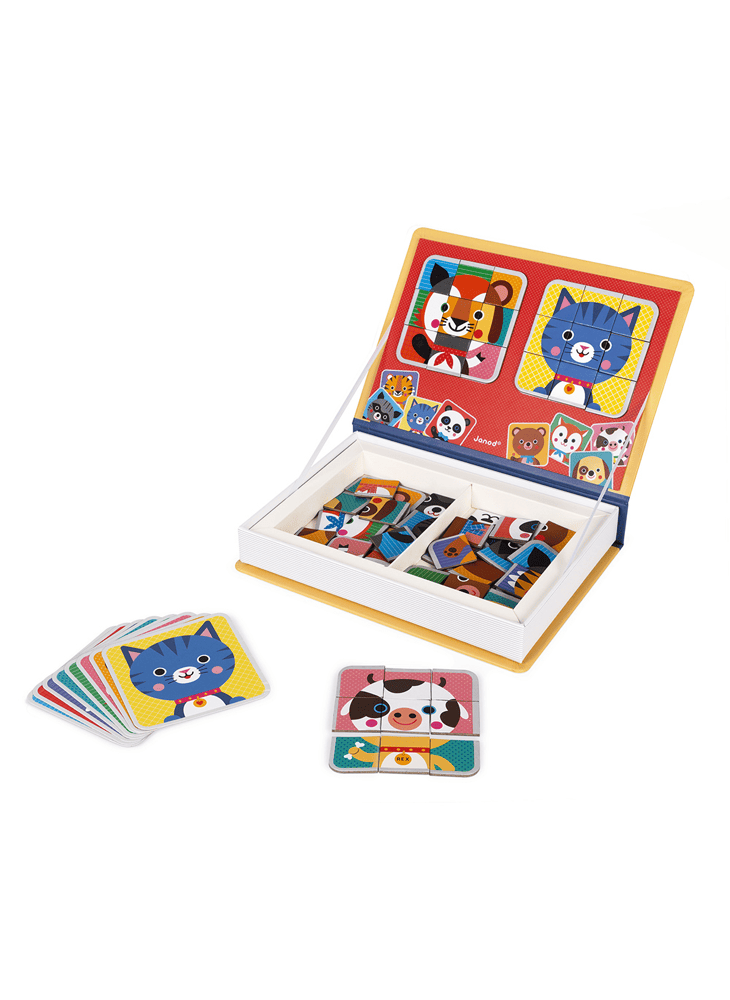 Kent u het Magnéti'boek? Deze nomadische en educatieve magnetische boeken worden aanbeden door jong en oud! Het principe ? Deze magnetische doos bevat veel magnetische elementen om te combineren door de modellen te volgen of je creativiteit het woord te laten doen! Dit kartonnen spel vervoert kinderen vanaf 3 jaar naar het land van de dieren dankzij de 72 magneten en 8 modelkaarten. Binnenin kun je met een magnetische scène het portret van het dier op de kaart opnieuw samenstellen met behulp van de magneten. Het kind kan ook veel plezier beleven aan het mixen van de verschillende stukken om grappige en excentrieke dieren te creëren, aangezien ze allemaal uitwisselbaar zijn! Lachen in perspectief! Hiermee kan het kind zijn verbeeldingskracht en fijne motoriek verbeteren.