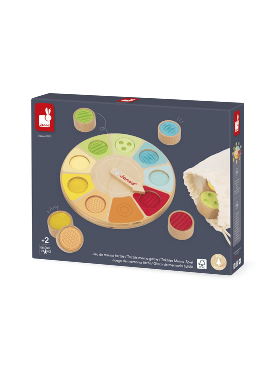 Ontdek het Janod Sensorisch Wiel! Dit tactiele geheugenspel is perfect voor de allerkleinsten. Draai simpelweg aan de pijl op het bord en vind het bijbehorende stukje in het katoenen zakje door te voelen! Het spel bevat 9 houten stukjes met verschillende texturen en materialen: vilt, klittenband, een plat oppervlak, hout met textuur (2 stukjes) en siliconen met textuur (4 stukjes). Het ontwikkelt de tastzin en de hand-oogcoördinatie. Gemaakt van FSC™-gecertificeerd hout. Een leerzaam speeltje voor kinderen vanaf 2 jaar.