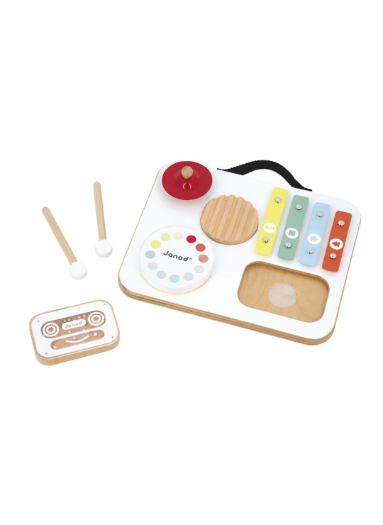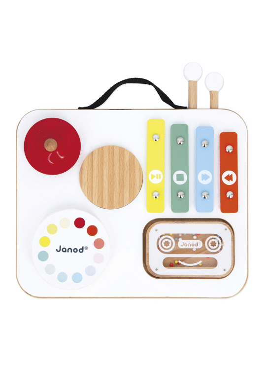 Prikkel de muzikale nieuwsgierigheid van je kleintjes met deze schattige houten muziektafel van Janod! Deze kleurrijke tafel is speciaal ontworpen voor peuters en biedt 5 activiteiten om spelenderwijs geluiden te ontdekken: een krasstokje, een trommel, een rood cimbaal, een veelkleurige xylofoon en een rammelcassette gevuld met kralen. De drumstokjes kunnen handig op het tafelblad worden opgeborgen en dankzij het handvat is de tafel gemakkelijk overal mee naartoe te nemen! Met zijn vrolijke kleuren en speelse vormen stimuleert het de zintuiglijke ontwikkeling, de coördinatie en de liefde voor muziek. Aantrekkelijk, stevig en perfect formaat voor kleine handjes. FSCT-gecertificeerd houten muziekspeelgoed, geschikt voor kinderen vanaf 12 maanden.