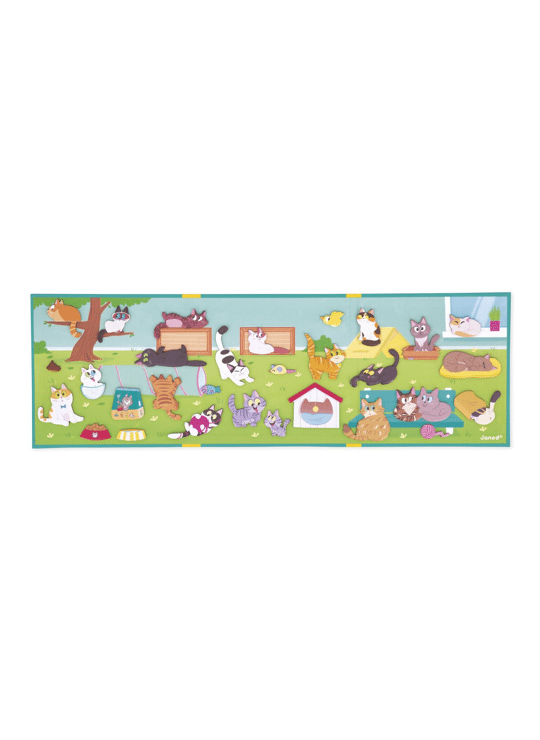 Laat je fantasie de vrije loop met deze bende katten! Elk katje heeft zijn of haar favoriete plekje: op een tak, in een mandje of verstopt! Dankzij de grote magnetische achtergrond met 30 magneten kan je kind zijn of haar eigen verhalen bedenken door de katten naar hartenlust te verplaatsen. Een perfect draagbaar formaat om overal en altijd mee te spelen. Een spel dat de fantasie, creativiteit en fijne motoriek stimuleert. Magnetisch speelgoed gemaakt van FSC™-gecertificeerd karton. Speelgoed voor kinderen vanaf 3 jaar.