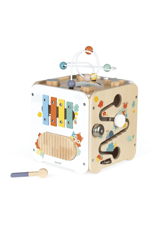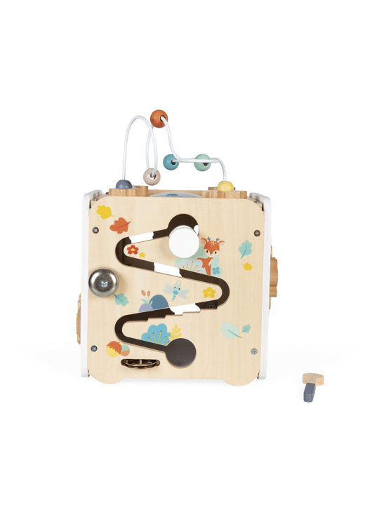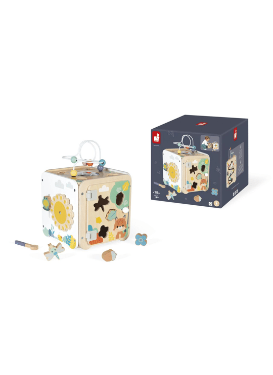 Ontdek alle activiteiten in deze grote kubus! Je vindt er de schattige diertjes uit de Pure-serie. Er zijn meer dan 8 activiteiten te ontdekken op de 5 zijden van de kubus, waaronder: een metalen xylofoon met hamertje, een krabpaal, een bolle spiegel, een loopband, 4 houten stukjes (bloem, hazelnoot, libelle en blad) die je bovenop kunt plaatsen of kunt gebruiken met de vormsorteerder aan de zijkant, een rol met een spoel die een bel en bekkens laat rinkelen, en tot slot een kikker die op en neer gaat terwijl hij de zon ronddraait. Aan de kant van de vormsorteerder zit een magnetisch deurtje waarmee je de stukjes eruit kunt halen. Let op de plastic scharnieren, die gemakkelijk weer vast te maken zijn als het deurtje losraakt. Ontwikkelt de fijne motoriek en hand-oogcoördinatie. FSC™-gecertificeerd houten ontwikkelingsspeelgoed, voor kinderen vanaf 18 maanden.