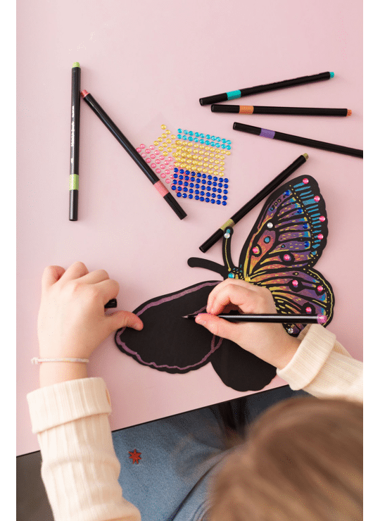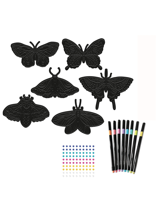 6 reliëfplaatjes in de vorm van vlinders om in te kleuren met de 8 metallic stiften. De stiften hebben felle kleuren en een penseelpunt. Je kunt de vlinders verder versieren met edelstenen voor een nog sprankelendere look.