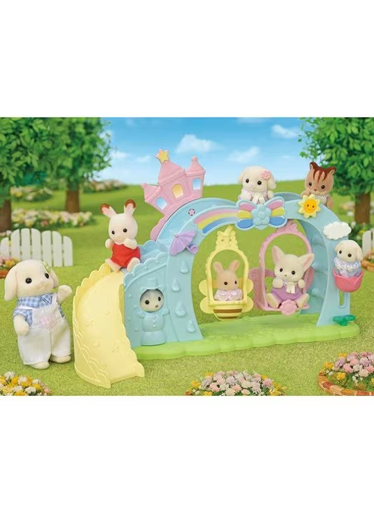 De baby speeltuin heeft een schommel en glijbaan en een lift die perfect is om lekker te spelen. Je Kunt ook verstoppertje spelen. Het wordt geleverd met 1 baby creme konijn speelfiguur . Je kunt fijn spelen met de fluweelzachte baby, je kunt de armen, benen en hoofd bewegen. De baby ziet eruit als een vlinder of als een bij als ze op de schommel zit. Een baby kan met de tulpenlift op en neer rijden. Stimuleert verhalen verzinnen voor kinderen. Geschikt voor kinderen vanaf 3 jaar en ouder.
