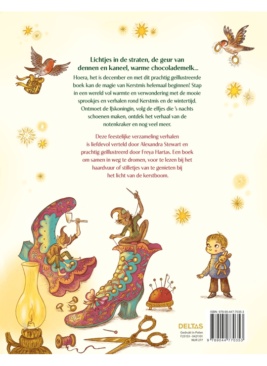 Maak kennis met de IJskoningin, ontdek het verhaal van de Notenkraker, volg de elfjes die ’s nachts stiekem schoenen maken en nog veel meer! Elk verhaal is prachtig naverteld door Alexandra Stewart en wordt helemaal tot leven gebracht door de kleurrijke tekeningen van Freya Hartas. Een boek om samen in weg te dromen, voor te lezen bij het haardvuur of stilletjes van te genieten bij het licht van de kerstboom.