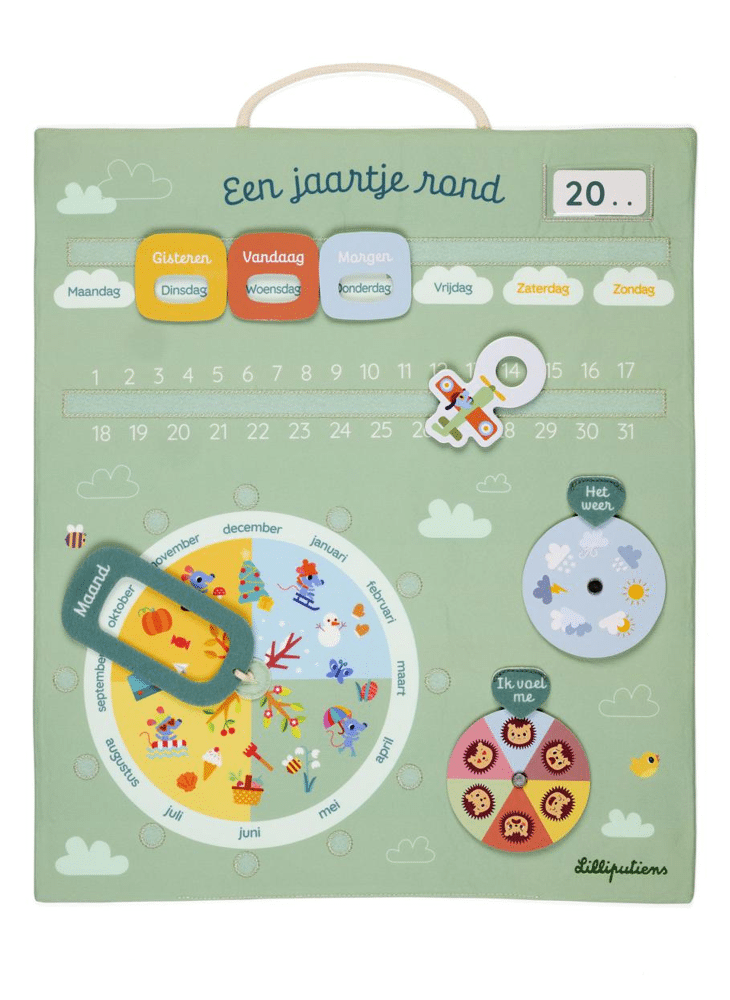 Een eerste ludieke kalander om de tijd te leren begrijpen! Met dit stoffen paneel ontdekt het kind de begrippen gisteren, vandaag en morgen, terwijl het de seizoenen, het weer en zijn humeur van de dag verkent. Zowel educatief als leuk, nodigt het uit om mooie momenten van verbodenheid te delen.