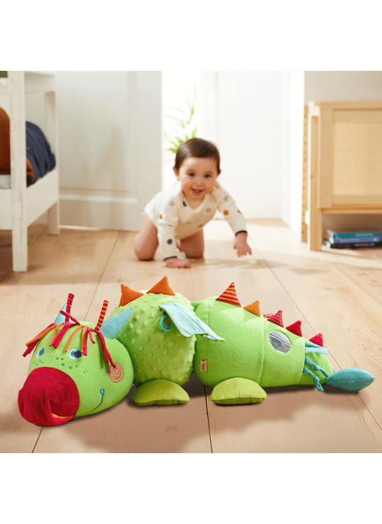 Je baby gaat op een grote ontdekkingstocht samen met deze grappige draak. Diverse elementen nodigen uit tot uitgebreid voelen en ontdekken: rammelende en piepende poten, een knisperende vleugel, een spiegeltje, een leuke rammelaarsfunctie en nog veel meer. Grappig: zijn neus heeft een insteekvak waarin ander speelgoed of doekjes kunnen worden verstopt. En, niet onbelangrijk, deze zachte drakenvriend is heerlijk om mee te knuffelen. Hij is dus knuffelzacht en slim!