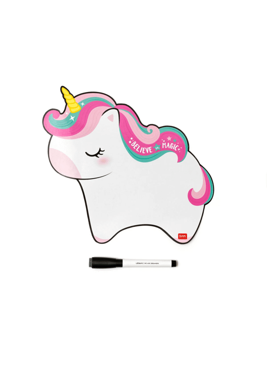 Noteer je gedachten onderweg met het magnetische whiteboard met eenhoornmotief van Legami. Bevestig het aan je koelkast of een ander metalen oppervlak om je boodschappenlijstje bij te houden, ideeën te onthouden of berichtjes achter te laten. Magnetisch whiteboard met droog uitwisbare stift, inclusief viltstift en wisser.